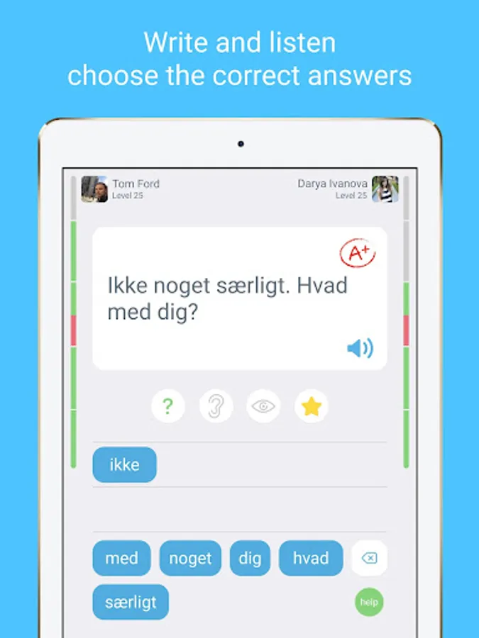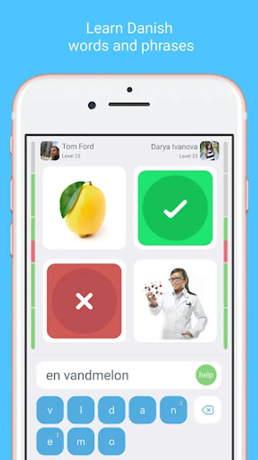 Playing online is also one of the best ways to test your knowledge of Danish vocabulary. Play in duo mode with your friends or other players. The app features useful functions that enable you to do exercises and take tests, or only study what you have gotten wrong. You can also skip the Danish for Beginners course and move to more advanced Danish lessons.