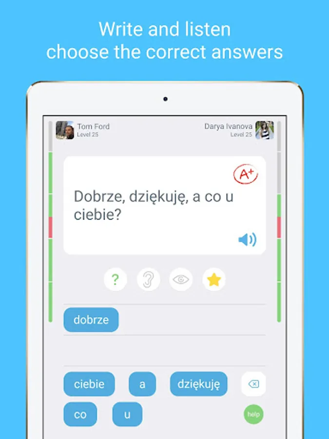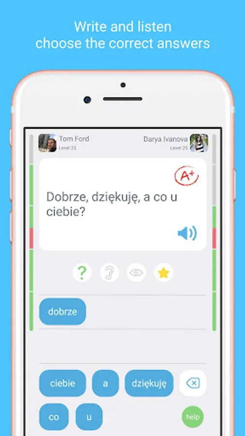 Playing online is also one of the best ways to test your knowledge of Polish vocabulary. Play in duo mode with your friends or other players. The app features useful functions that enable you to do exercises and take tests, or only study what you have gotten wrong. You can also skip the Polish for Beginners course and move to more advanced Polish lessons.