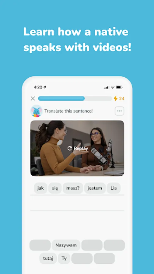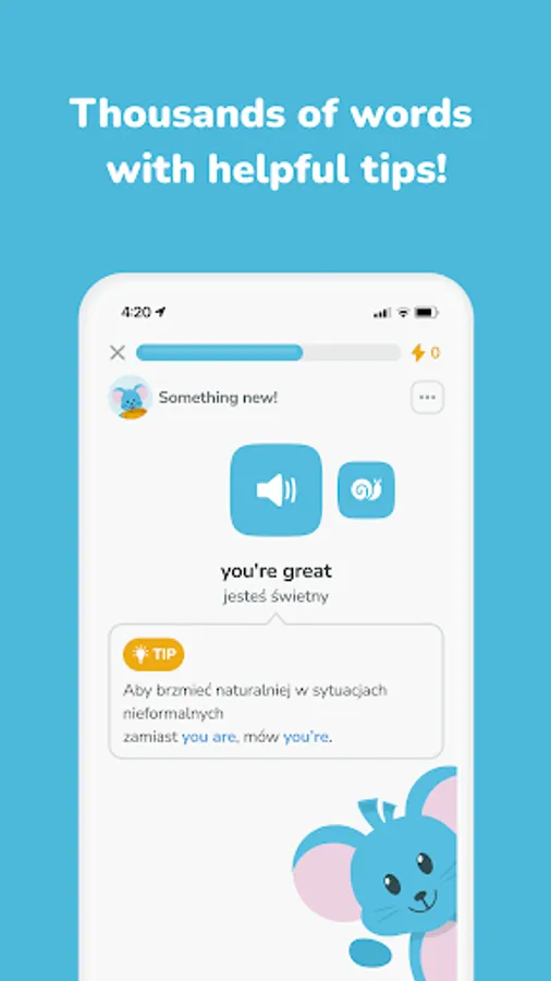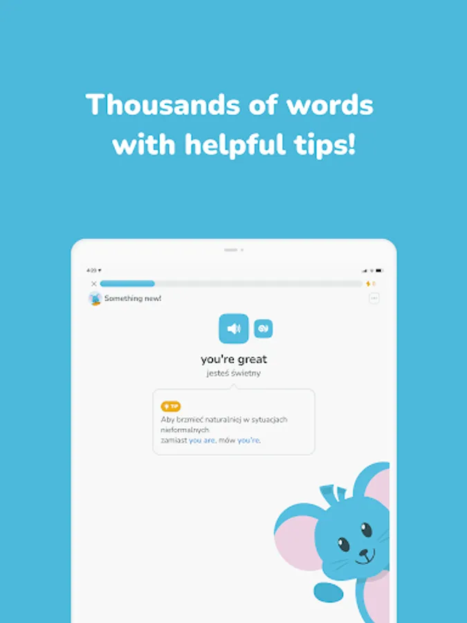 The app has been designed by a group of linguists and natives of each language, to turn studying into pure joy. You can study and improve your vocabulary wherever, and whenever you want. The Lingo mouse will be always there to motivate you or to show you your progress.
