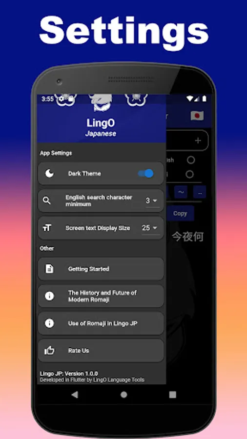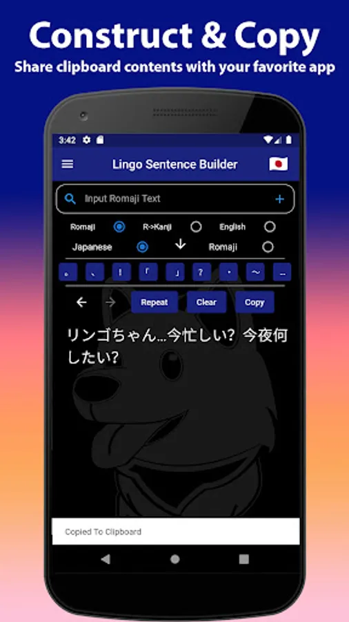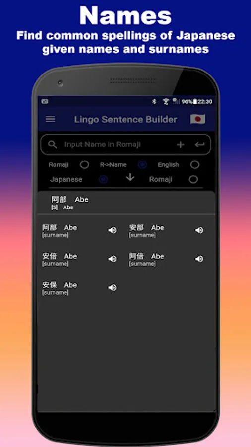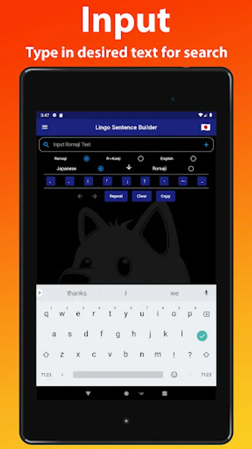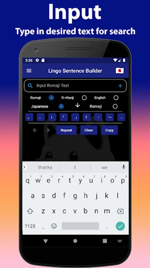 Lingo Japanese Romanization is the definitive Japanese Language Romanization input tool to assist speakers who struggle with keyboard text input and spelling. It can also be used as a great learning tool & dictionary- all contained within this single app on your device - on the go & when you need it - without the need for any type of data or wifi connection!!!