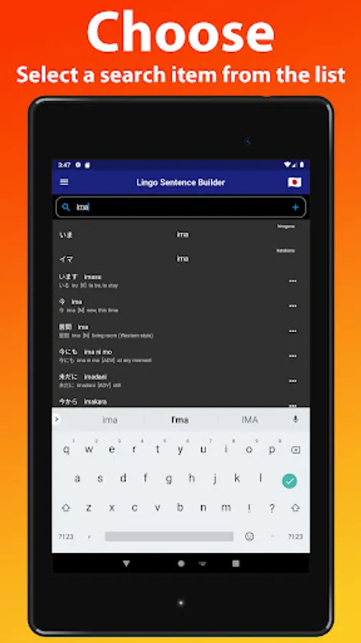 • Select the word or phrase you wish from a selectable list that automatically updates and refines your list from each letter you input into the Lingo app or from a list of direct kana conversions (such as hiragana or katakana).