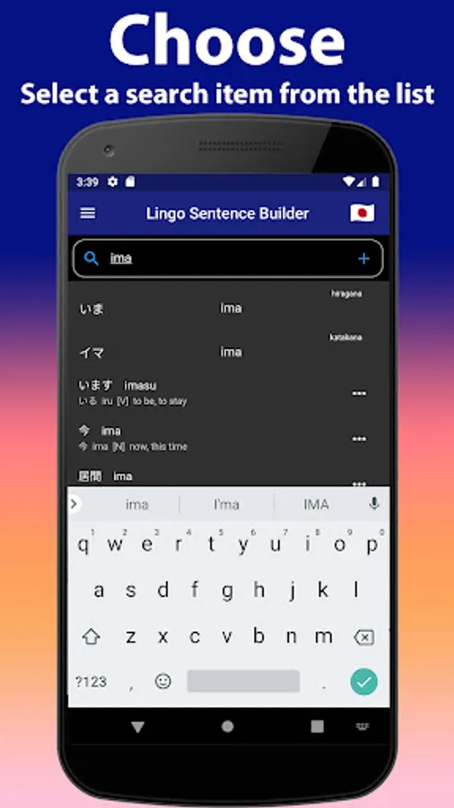 • Select the word or phrase you wish from a selectable list that automatically updates and refines your list from each letter you input into the Lingo app or from a list of direct kana conversions (such as hiragana or katakana).
