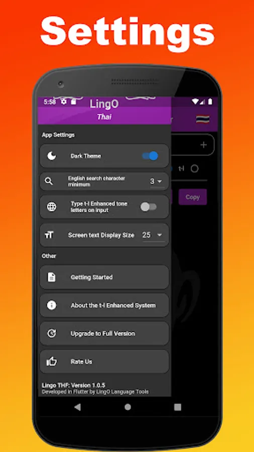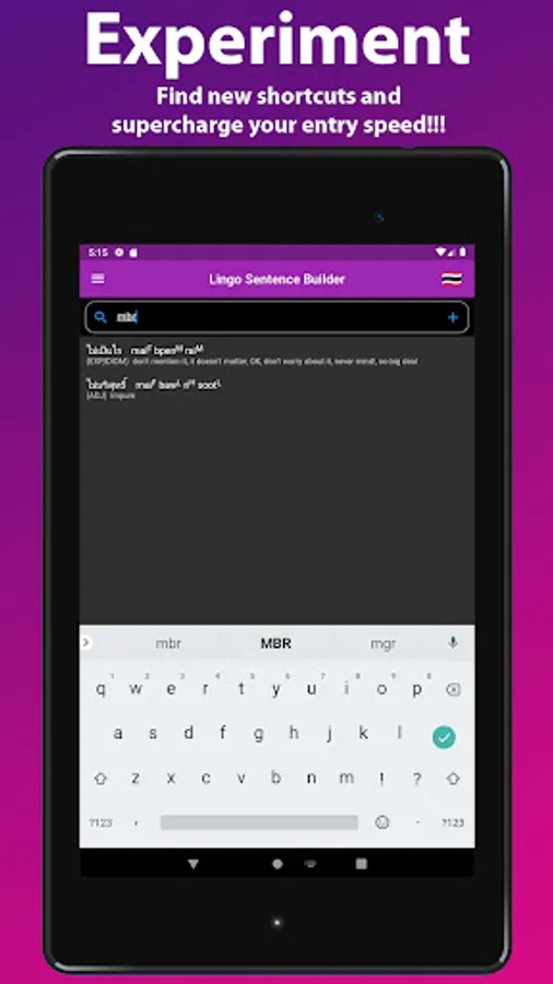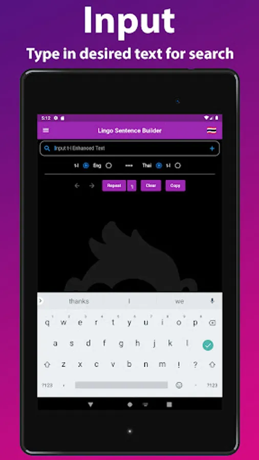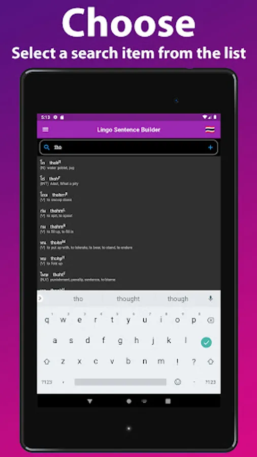 Lingo THF is a free version of the definitive Thai Language Romanization input tool for speakers who struggle with keyboard text input and spelling. It can also be used as a great learning tool & dictionary- all contained within this single app on your device- on the go & when you need it- without the need for any type of data or wifi connection!!!