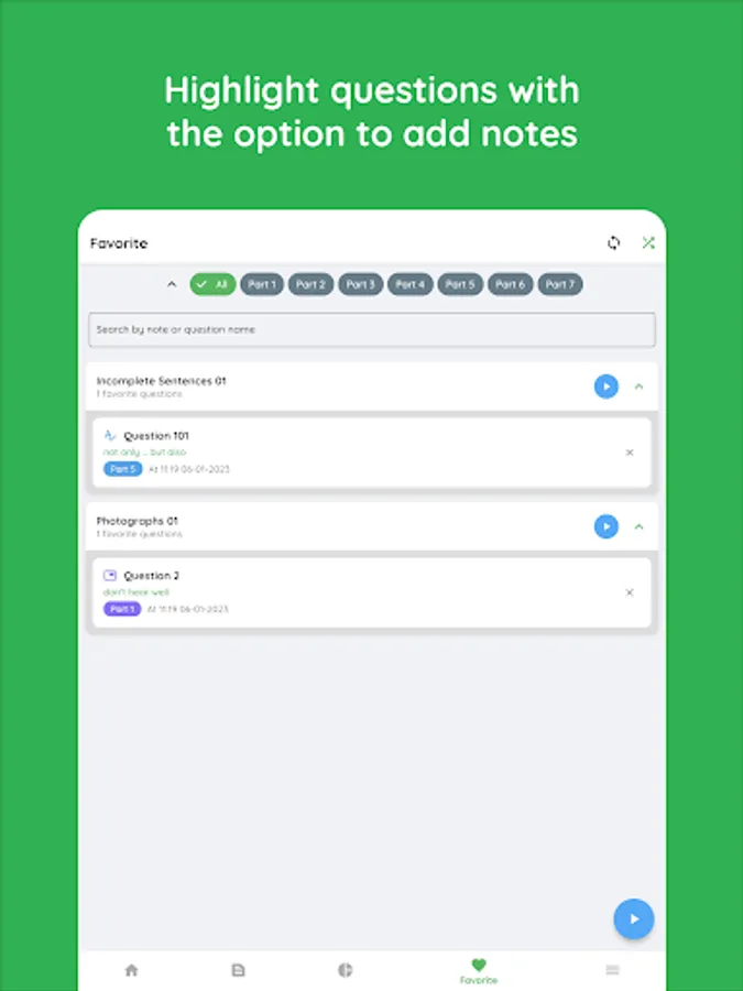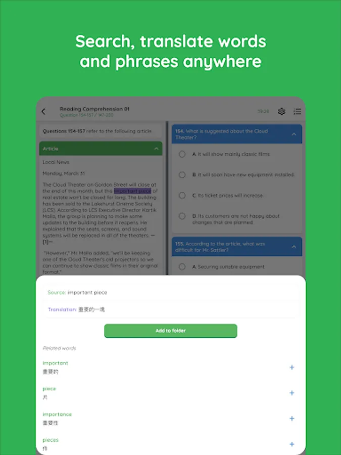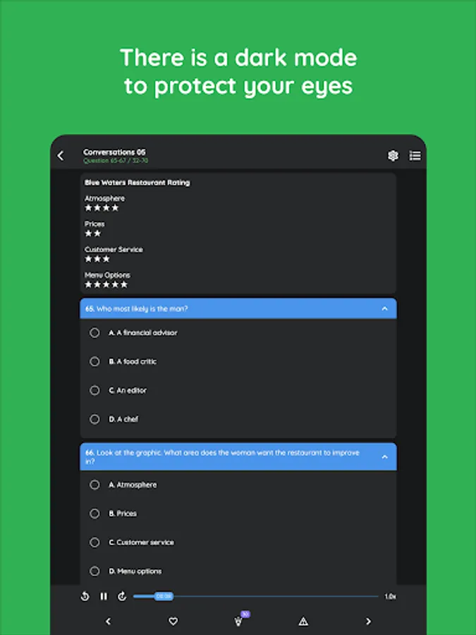 - Support features such as changing font size, font family, automatic question switching, split screen, increase and decrease the audio speed.