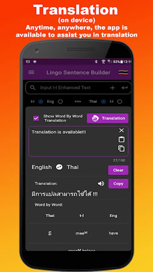 NEW!!! Complete on-device Thai-English and English-Thai translation at your fingertips. (Internet/cell phone data not required). Language assistance wherever and whenever you need it. We are not in the business of collecting data. Your privacy is our guarantee here at Lingo Language Tools.