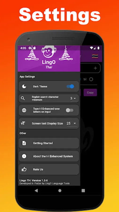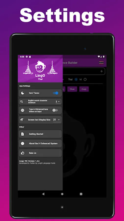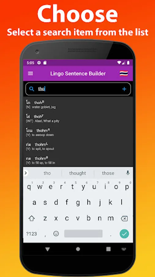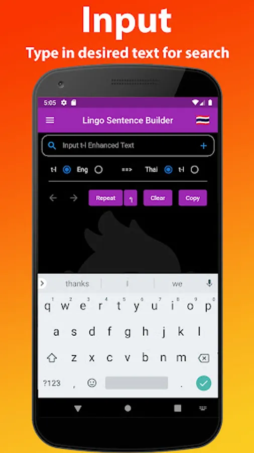 Lingo TH is the definitive Thai Language Romanization input tool for speakers who struggle with keyboard text input and spelling. It can also be used as a great learning tool & dictionary- all contained within this single app on your device- on the go & when you need it- without the need for any type of data or wifi connection!!!