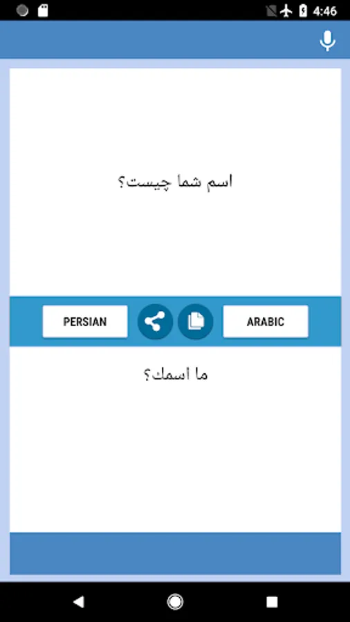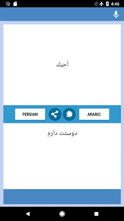 Persian-Arabic Translator app - free and easy to use. You can translate text and letters from Persian to Arabic and from Arabic to Persian back. The translate app conveniently to use with chats, messengers and social networks.You can use this converter at work, school, dating, while travelling or during business trips to improve your masterly of these two languages, also you can use this as Persian-Arabic and Arabic-Persian converter, interpreter, dictionary. Download Translation App and begin improve your language skills now!