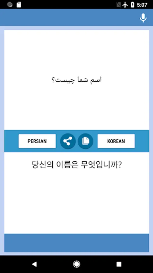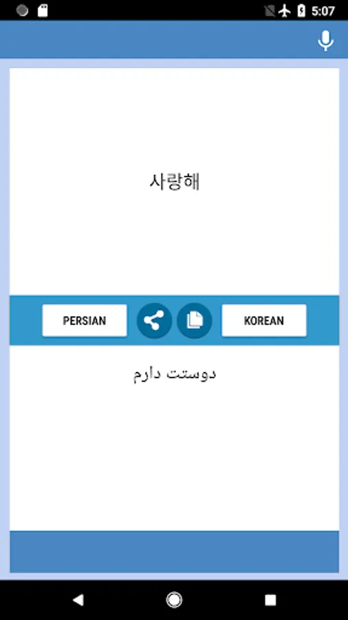 Persian-Korean Translator app - free and easy to use. You can translate text and letters from Persian to Korean and from Korean to Persian back. The translate app conveniently to use with chats, messengers and social networks.You can use this converter at work, school, dating, while travelling or during business trips to improve your masterly of these two languages, also you can use this as Persian-Korean and Korean-Persian converter, interpreter, dictionary. Download Translation App and begin improve your language skills now!