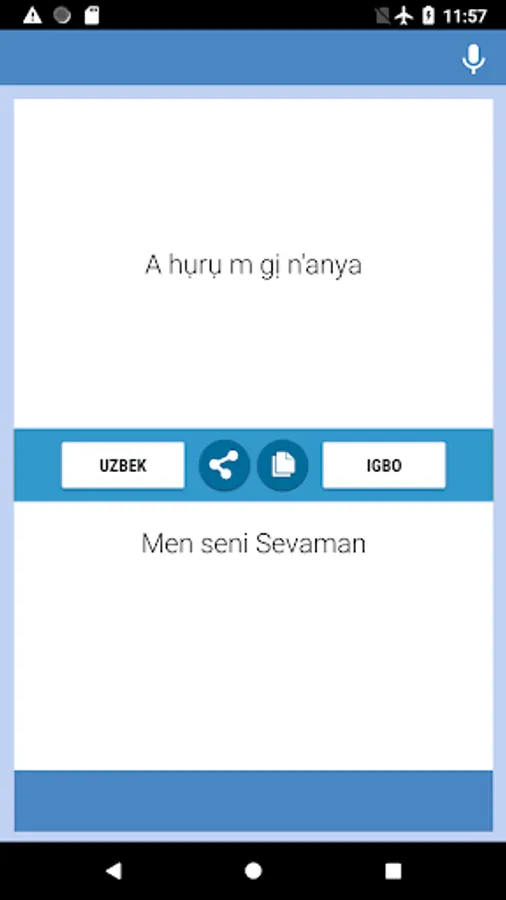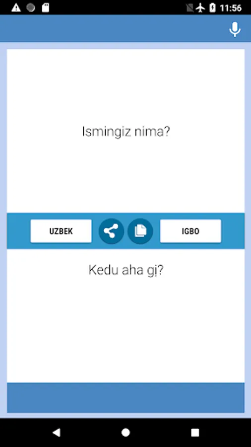 Uzbek-Igbo Translator ngwa - n'efu ma dị mfe iji. Ị nwere ike ịsụgharị ederede na akwụkwọ ozi site na Uzbek ka Igbo na Igbo ruo Uzbek azụ. Ị nwere ike iji onye ntụgharị a na-arụ ọrụ, ụlọ akwụkwọ, mkpakọrịta, mgbe ị na-ejegharị ma ọ bụ mgbe ị na-azụ ahịa iji meziwanye asụsụ gị nke abụọ a, ị nwekwara ike iji nke a dị ka Uzbek-Igbo na Igbo-Uzbek converter, onye ntụgharị okwu, akwụkwọ ọkọwa okwu.