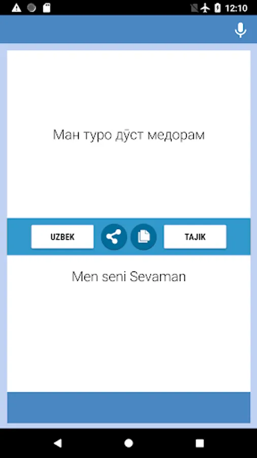 The Uzbek-Tajik translator is free and easy to use. You can translate your text and letters from Uzbek to Tajik and from Tajik to Uzbek. You can use this app at work, school, while traveling or during busines trips to improve your reading of these two languages, also you can use it as an Uzbek and Tajik dictionary.