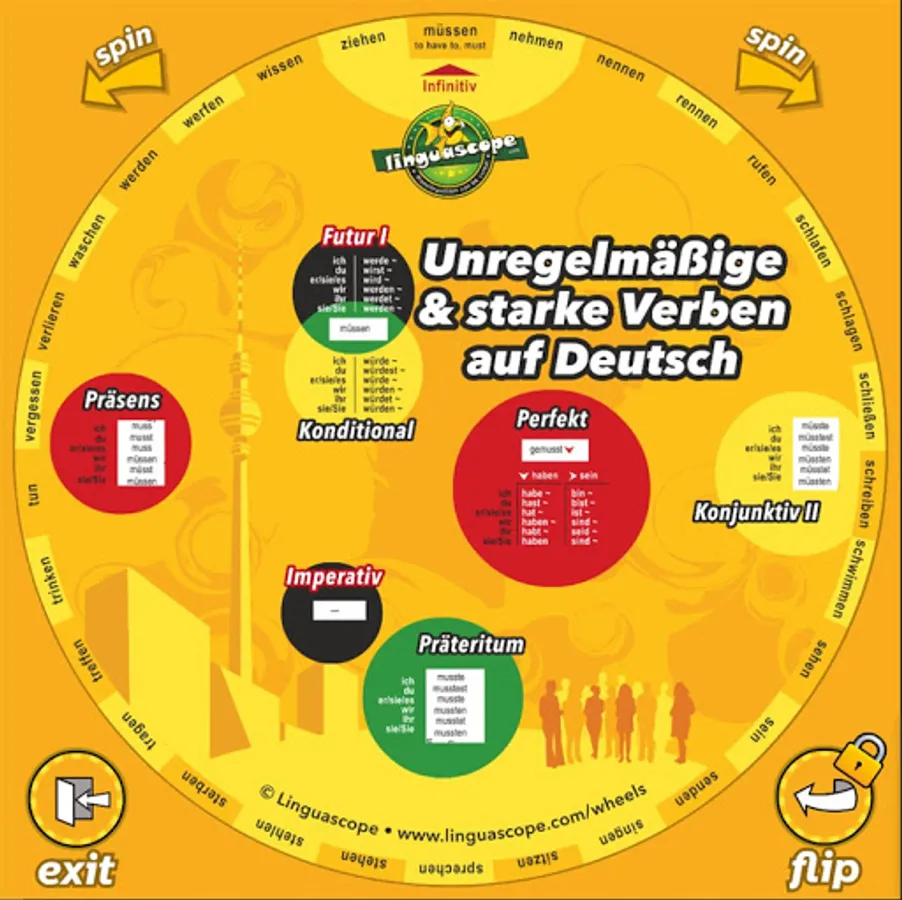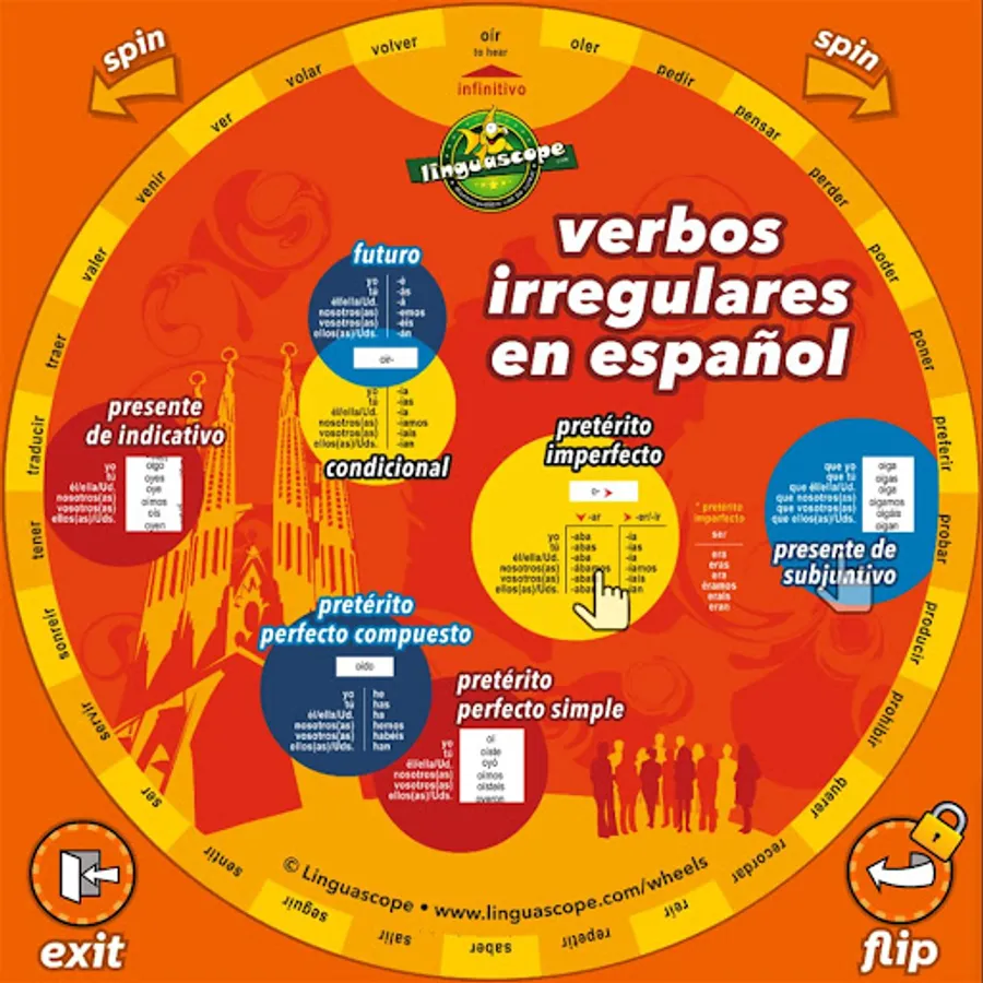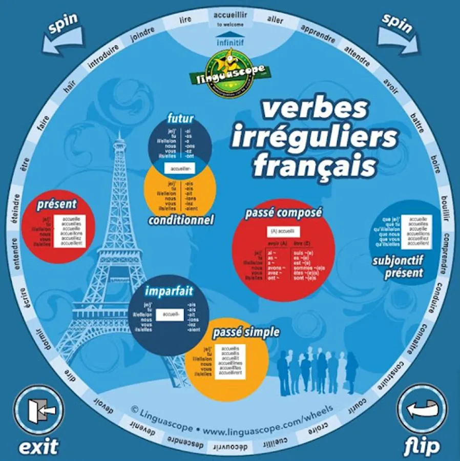 Each verb wheel is a double-sided learning and reference aid giving details of 60 frequently used verbs with an irregular conjugation (120 in English). Both sides of the disc also include simple grammatical charts describing the conjugation of auxiliary verbs, composite verb forms and personal pronouns.