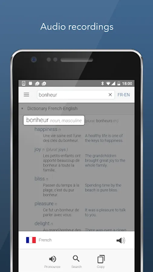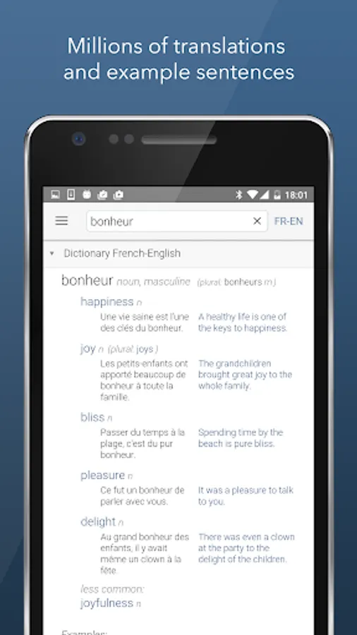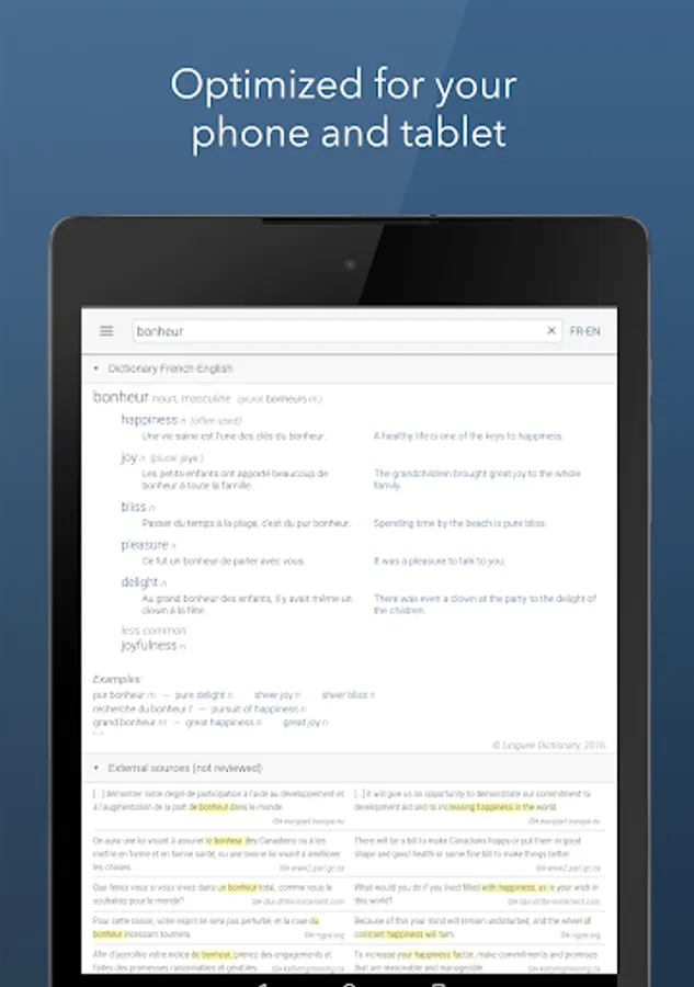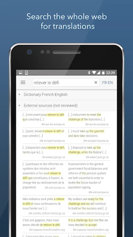 Linguee is a new kind of dictionary app for French-English, Spanish-English and other language pairs. You will find reliable translations in the shortest time, even when you're offline.