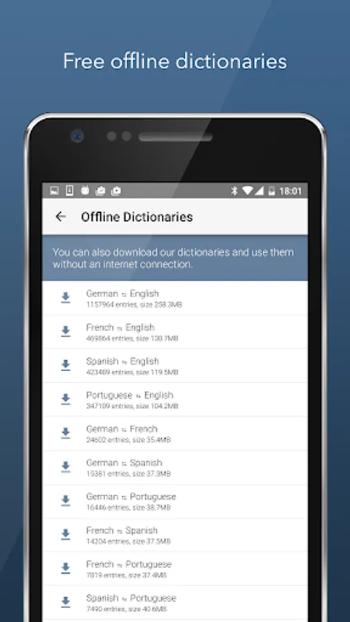 The editorial dictionaries can be downloaded for free and are subsequently available for use even when you're offline. This allows you, for example, to look up terms while you are abroad and have no data connection.