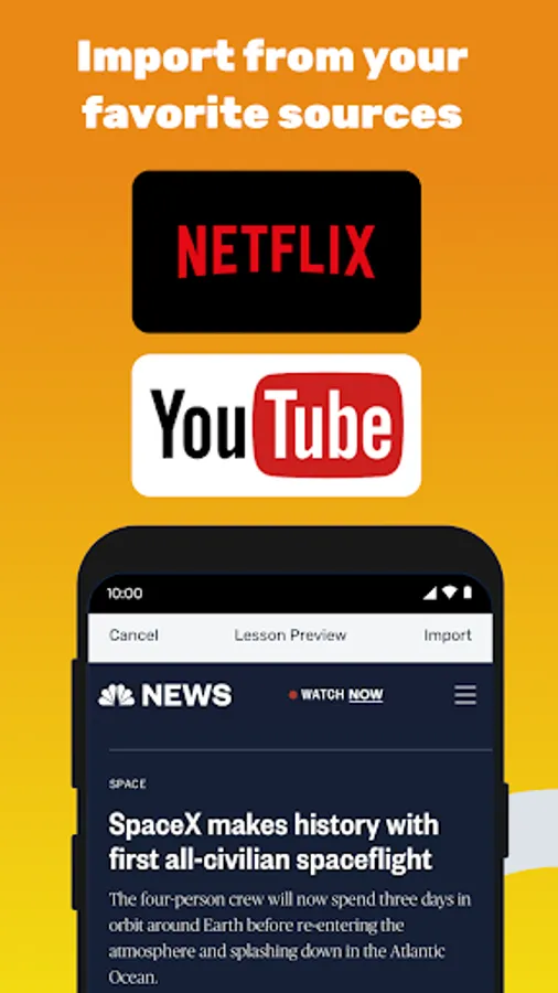 ✅ Import Your Favorite Content: Turn Netflix, YouTube, podcasts, books, and articles into personalized lessons.