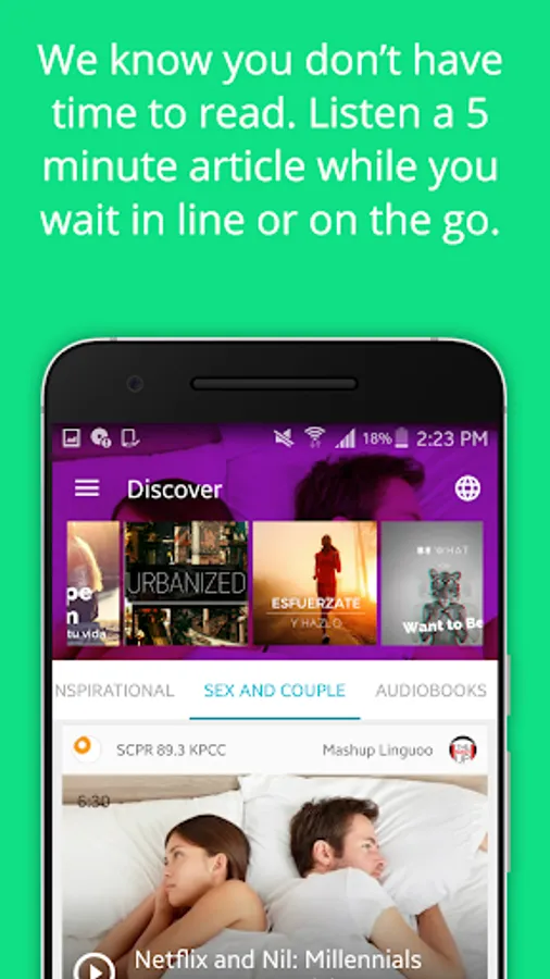 Listen to news and articles from the worlds best publishers and bloggers narrated by a global community. Whether commuting, working out at the gym, or cooking at home, let Linguoo accompany you with great articles every day.