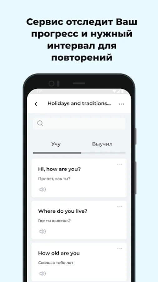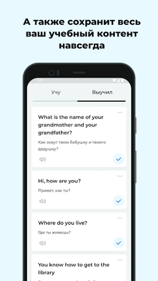 The application has built-in spaced repetition of phrases, thanks to which phrases are memorized naturally.