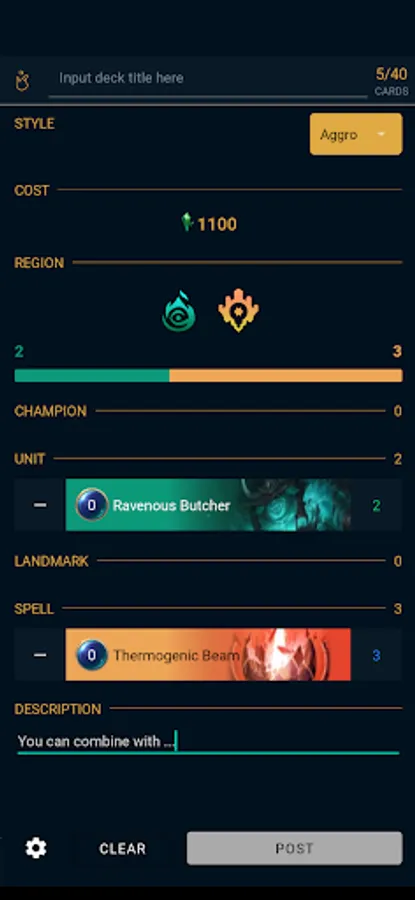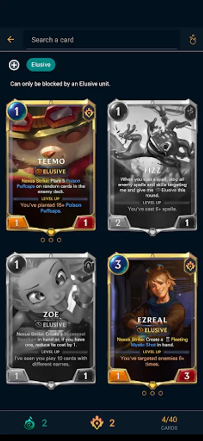 An application that showcases the list of available cards and the best meta decks. The user can use it to browse in game cards and find more information about a particular card's keywords and in game effects. They can also browse a collection of curated decks based on champions, and regions.