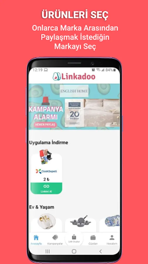 Download Linkadoo mobile app, choose the product and campaign you want from Karaca, Watsons, Çiçek Sepeti, Teknosa, English Home, Emsan, Jumbo, Bernardo, Chakra, Bella Maison, The Body Shop, Vivense, Flormar and many different popular brands.