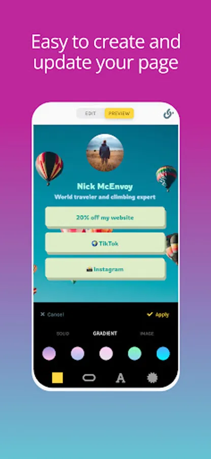 Stand out by personalizing your design with backgrounds, colours, fonts, badges and other elements that create a beautiful link in bio page.