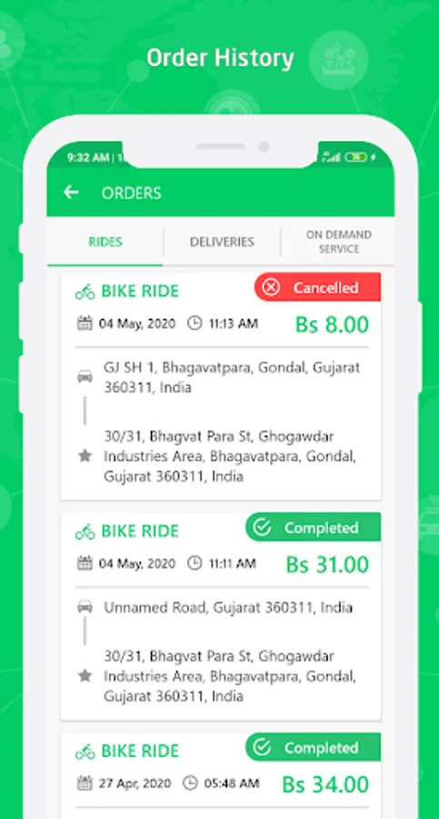 Tiene la opción de ver los viajes / pedidos pasados y futuros con los detalles de fecha y hora, dirección y monto del pedido.