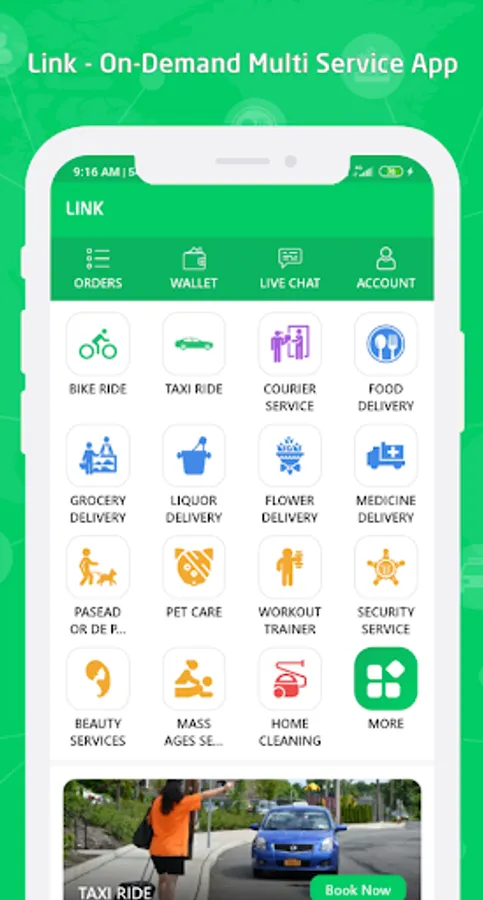 Obtenga los más de 30 servicios a pedido en una sola aplicación. Link ofrece un multiservicio en línea que incluye reserva de taxi, servicio de mensajería, entrega a pedido como alimentos, agua, comestibles, medicamentos, licores, servicios de proveedores como pasear perros, limpieza del hogar, reparación de aire acondicionado, belleza, control de plagas, lavandería, electricista, fontaneros, masajes, y mas servicios.