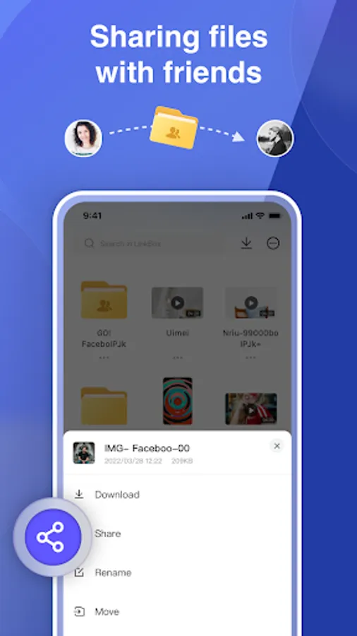 By sharing you can make files available to anyone. You can share files, photos, videos with friends and family. At the same time, it supports entering the shared folder, so as to obtain any files such as videos that are updated at the same time in other people's folders.
