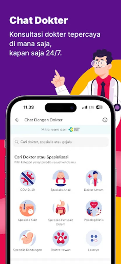 Dokter responsif yang terdiri dari berbagai macam spesialis: Dokter Umum, Dokter Anak, Dokter Bedah, Dokter Kulit, Psikiater, Dokter Gigi, Dokter THT, Dokter Kecantikan, Dokter Kehamilan, Dokter Mata, Dokter Hewan dan dokter lainnya.