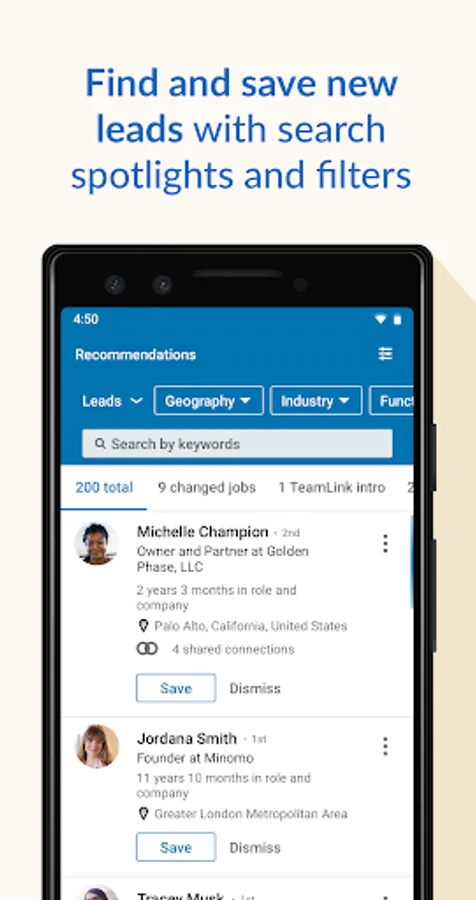 Whether you are waiting for a meeting, traveling between clients’ offices, or just in line for a coffee, Sales Navigator Mobile gives you access to Sales Navigator’s key sales features where you need them most: everywhere.
