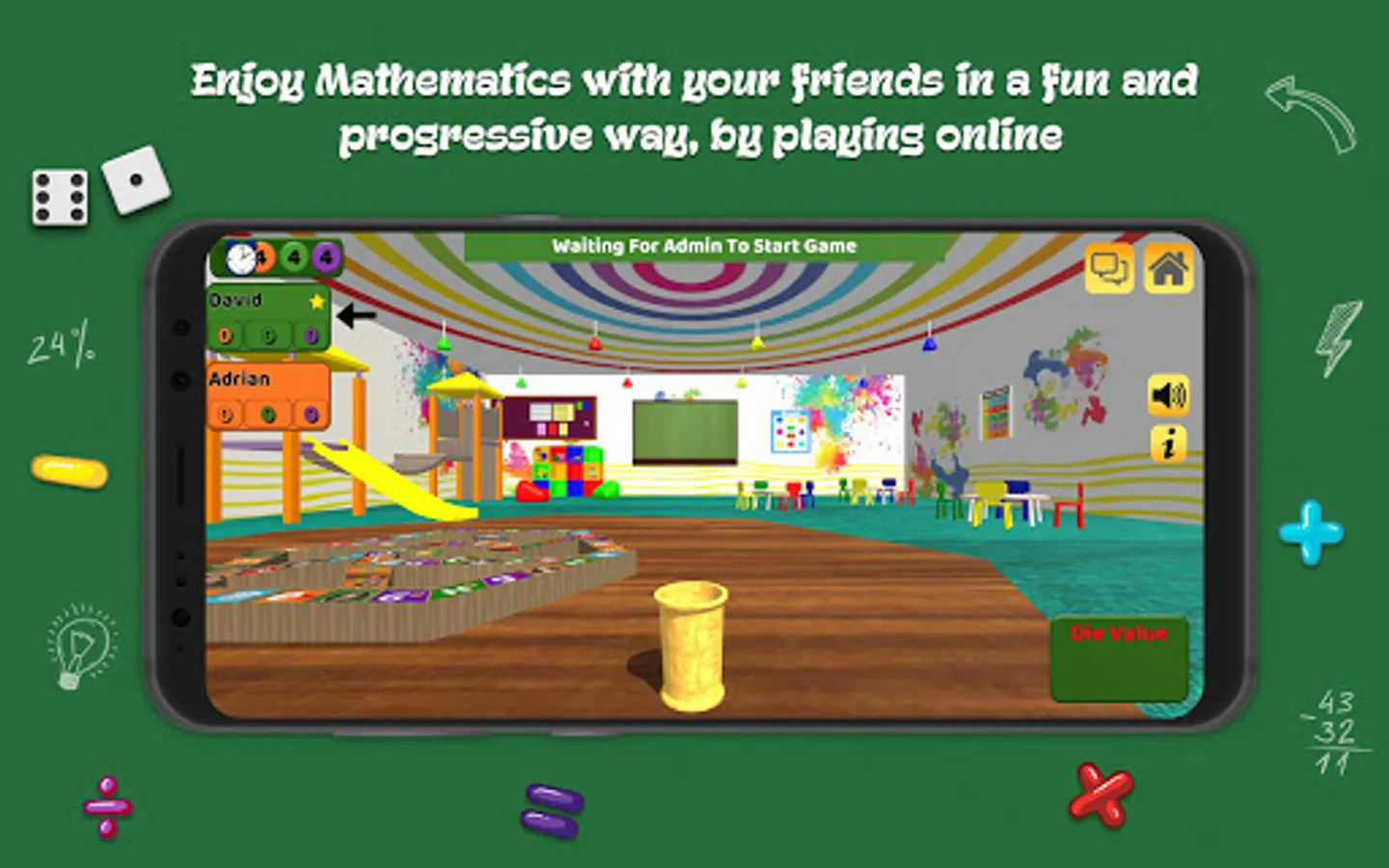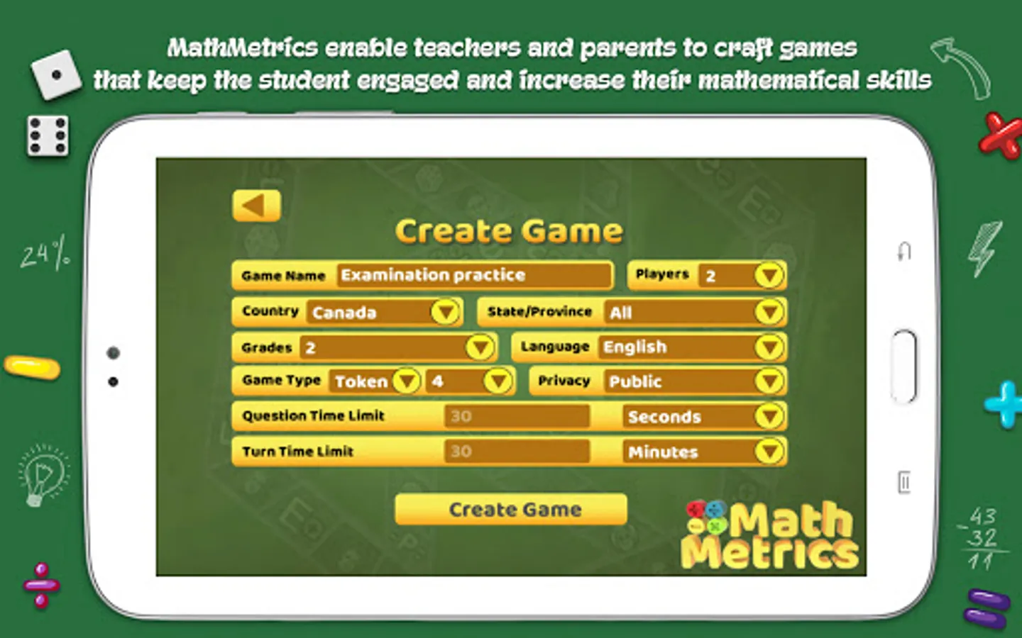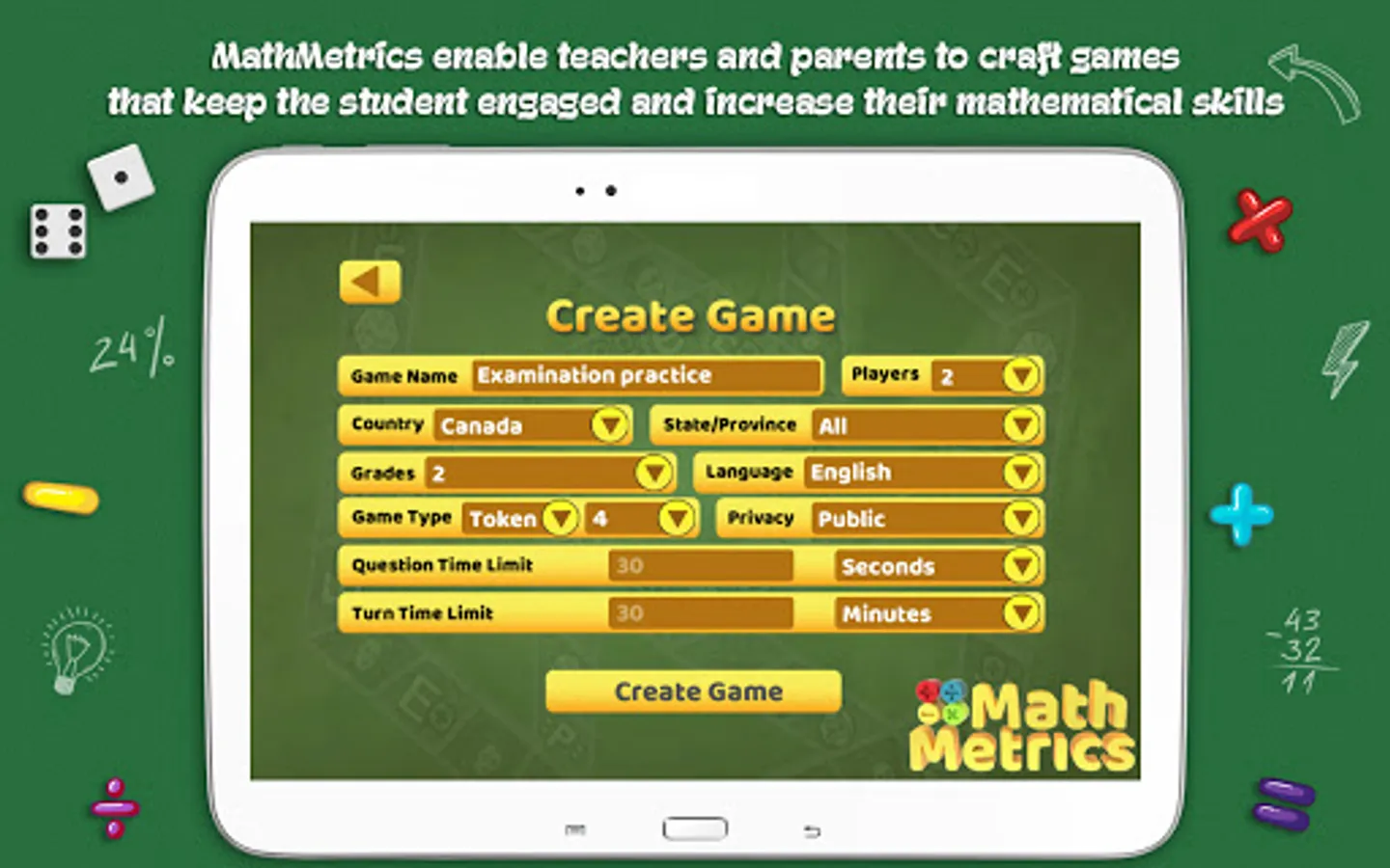 *Groups of 2 to 6 students in a class room with one device can use MathMetrics to compete and learn from each other while honing their mathematical skill.