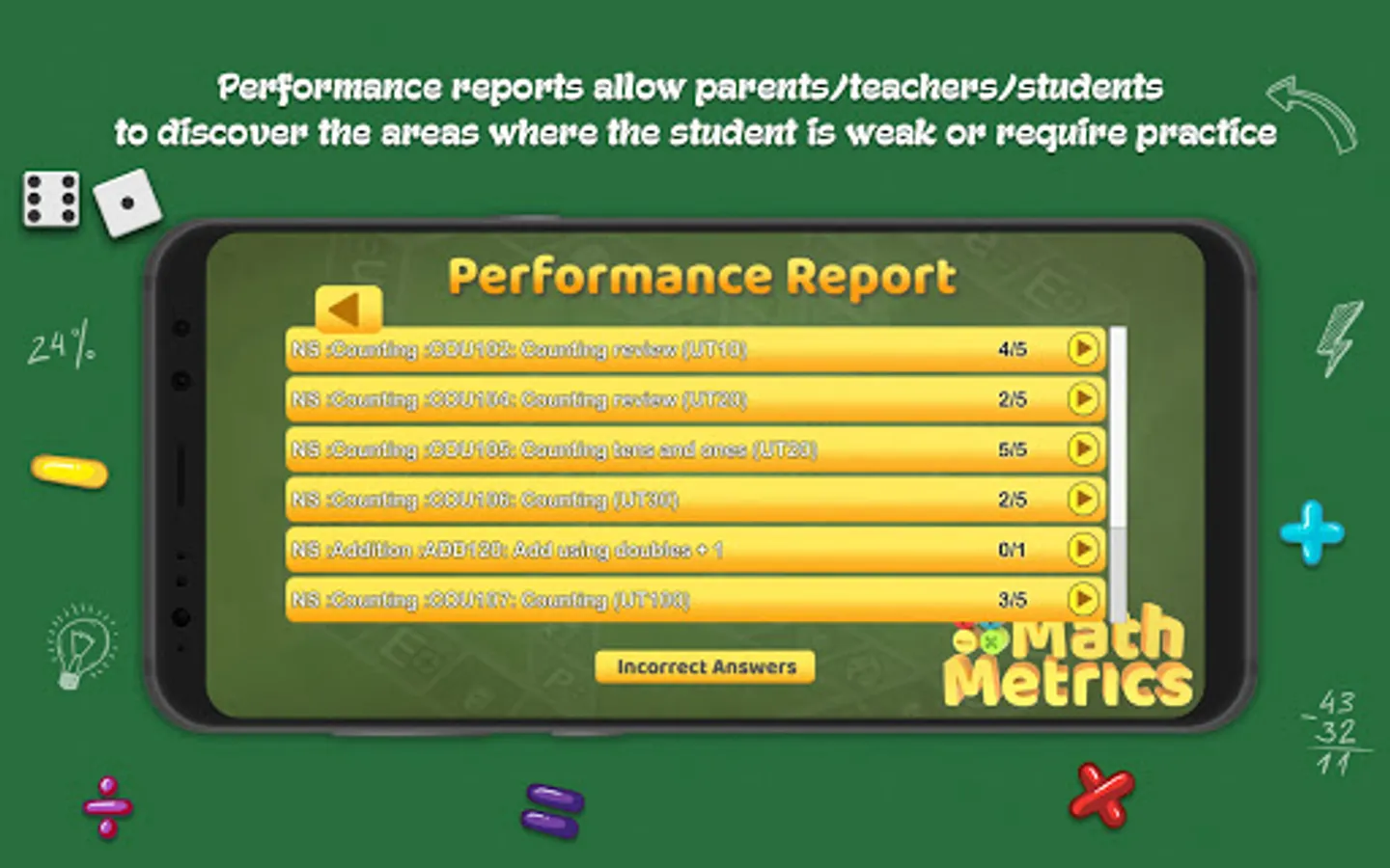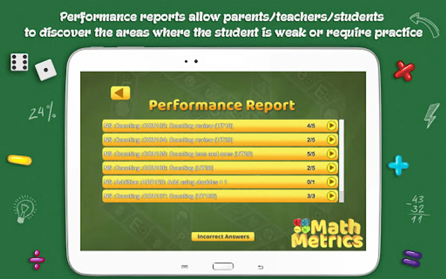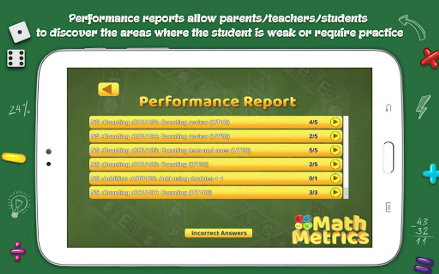MathMetrics is equipped to test every skill level and analyze each skill or concept. It keeps track of all your questions/answers in the game and offers diagnostic reports which allows parents/teachers/students to discover the areas where you may be weak or require practice. Your diagnostic information can easily be made available online, to your teacher or tutor via the Report Viewer system or conversely a teacher can make your report available to your parents.