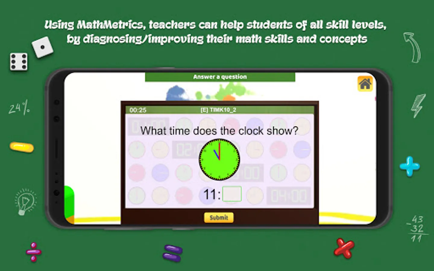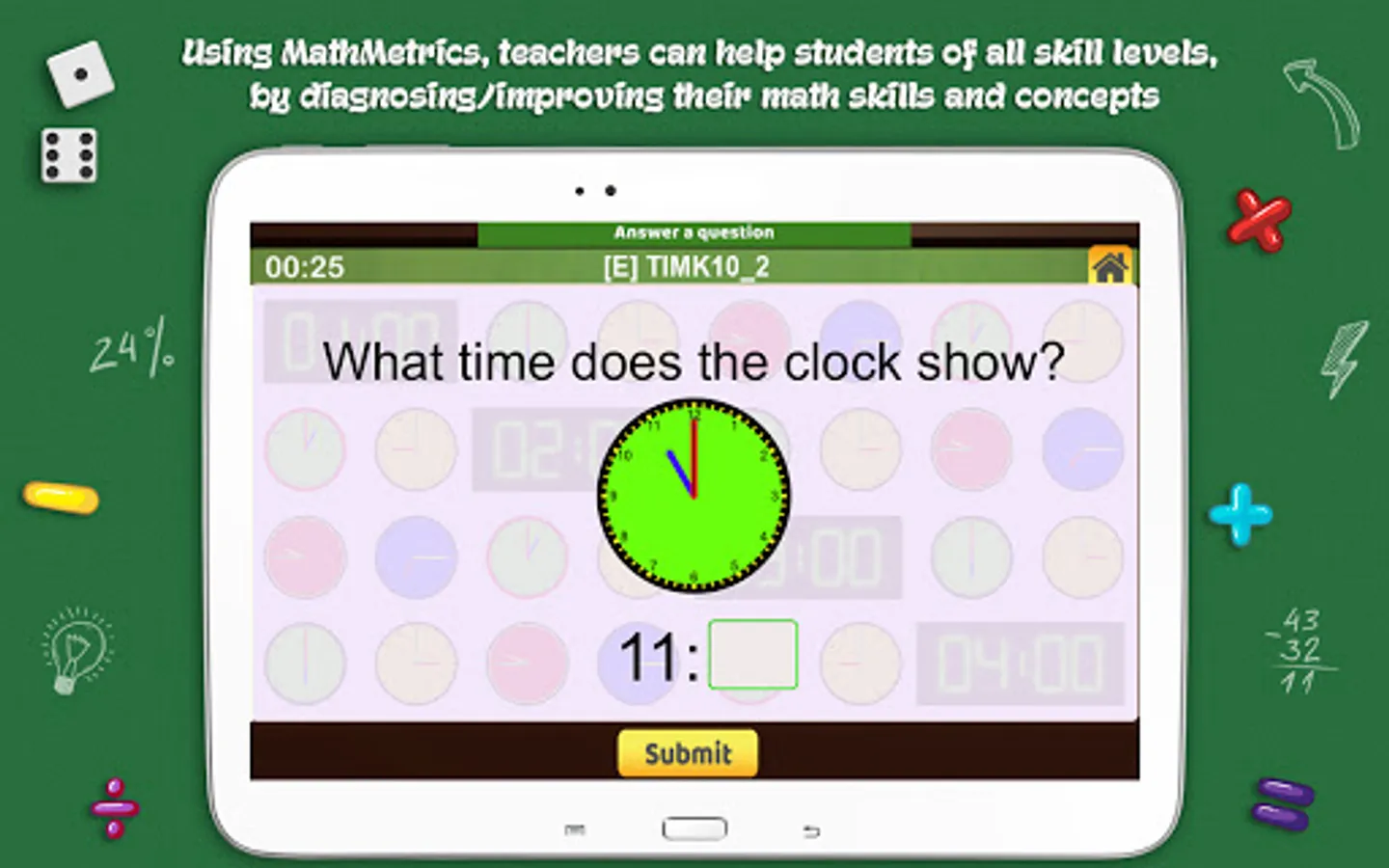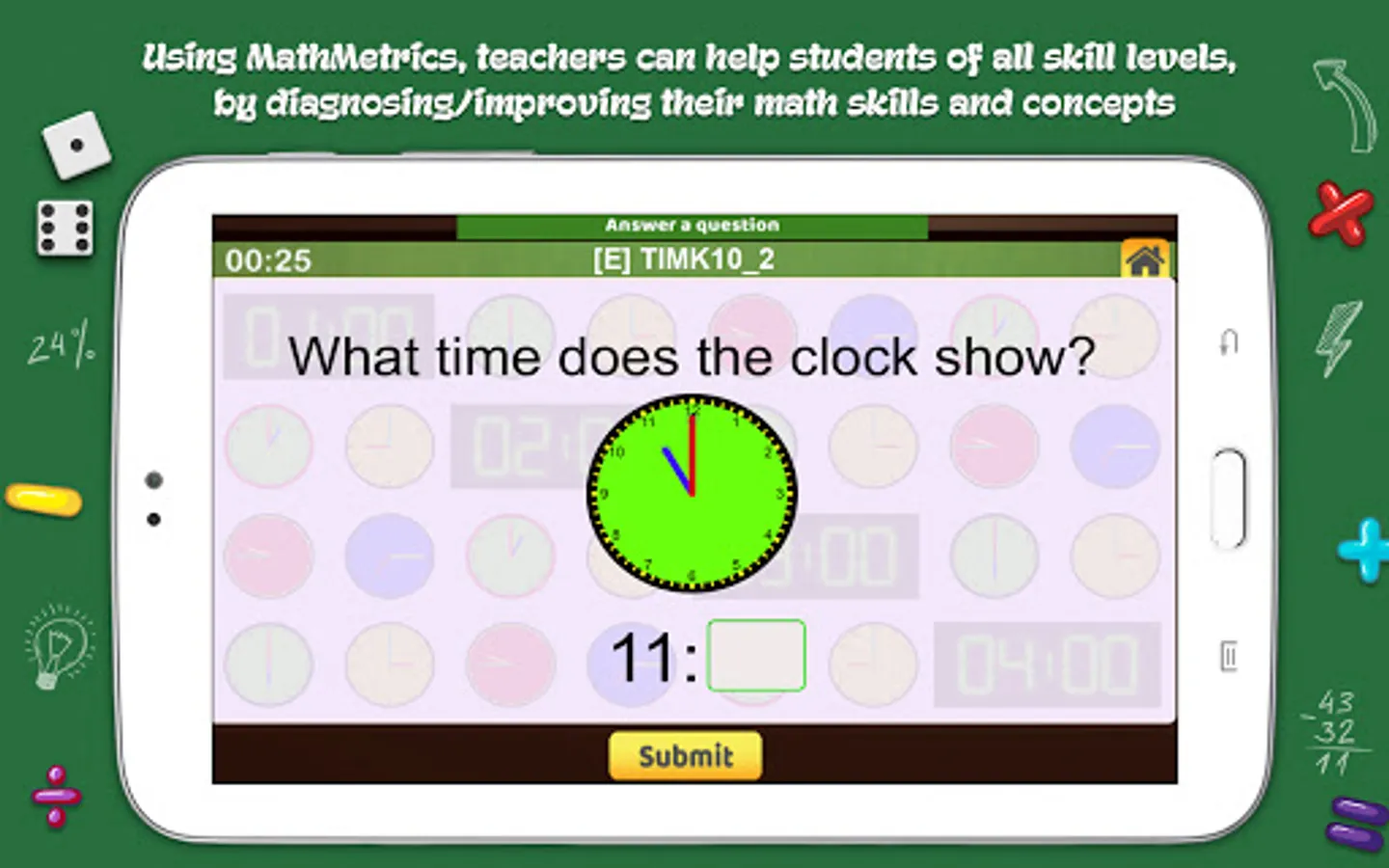 MathMetrics is equipped to test every skill level and analyze each skill or concept. It keeps track of all your questions/answers in the game and offers diagnostic reports which allows parents/teachers/students to discover the areas where you may be weak or require practice. Your diagnostic information can easily be made available online, to your teacher or tutor via the Report Viewer system or conversely a teacher can make your report available to your parents.