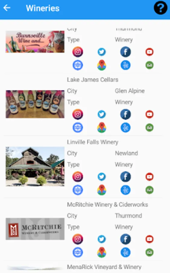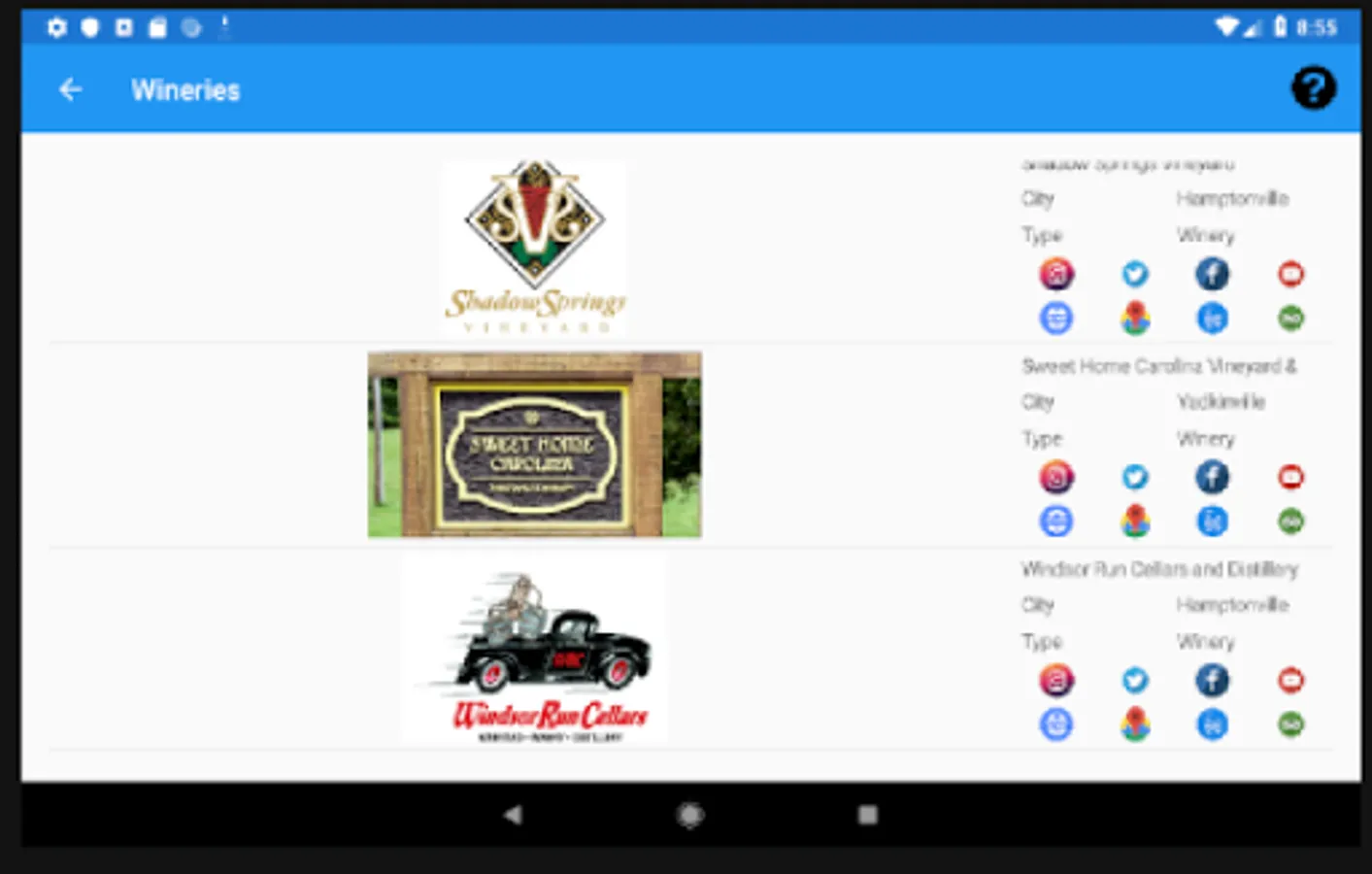 This app allows you to list the wineries, meaderies, cideries and distilleries by entering a partial name, selecting a county or selecting from the three geographical regions in North Carolina - Coast, Piedmont and Mountains. Using this app, you can plan your spirits-centered vacation using the mileage from your current location or the mileage around a certain point in the app. After displaying the wineries/meaderies/cideries/distilleries/shops/restaurants, you are one tap away from their Facebook, Instagram, Twitter, Youtube, website, Yelp, TripAdvisor and Google Maps sites. The restaurants and shops listed will carry North Carolina wines, meads and ciders.