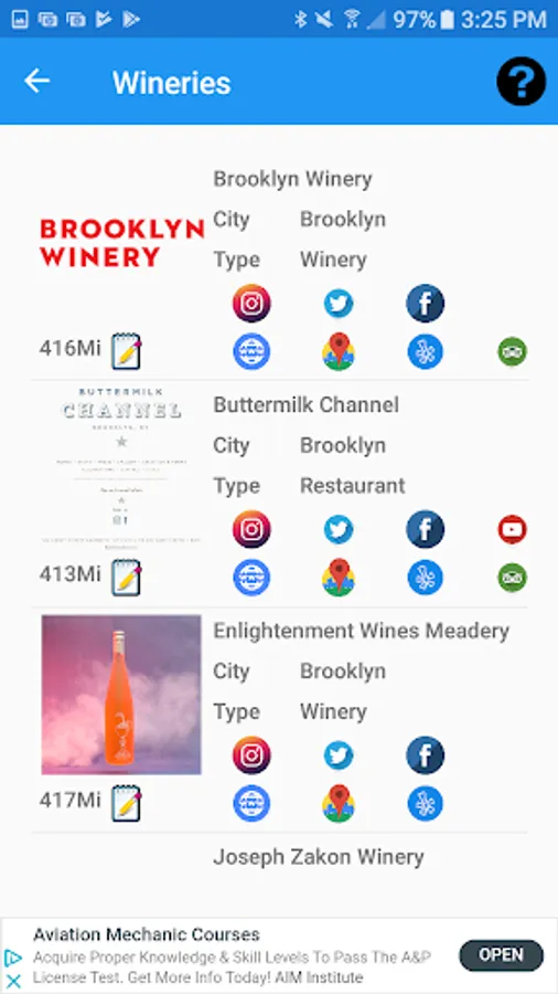 This app allows you to list the wineries, meaderies and distilleries by entering a partial name, selecting a county or selecting from the geographical sub-regions in New York - North Fork, Hamptons, Hudson River East/West, Champlain Valley, Keuka/Seneca/Cayuga/Canandaigua Lake, Niagara Escarpment, Greater Niagara, Lake Erie, Upper Hudson, NY City, Thousand Islands, Central, Lake Ontario and Western. Using this app, you can plan your wine-centered vacation using the mileage from your current location or the mileage around a certain point in the app. After displaying the wineries/meaderies/distilleries/shops/restaurants, you are one tap away from their Facebook, Instagram, Twitter, Youtube, website, Yelp, TripAdvisor and Google Maps sites. The restaurants and shops listed will carry New York wines.