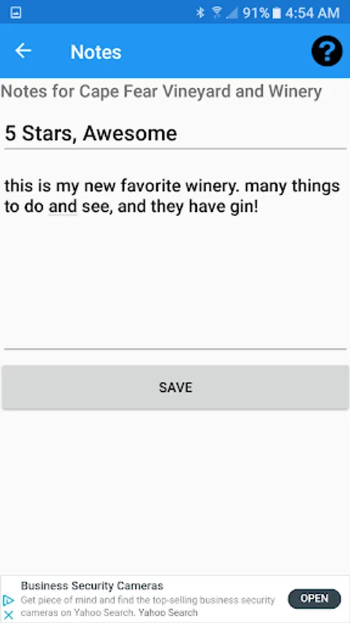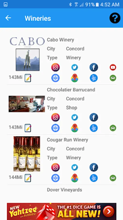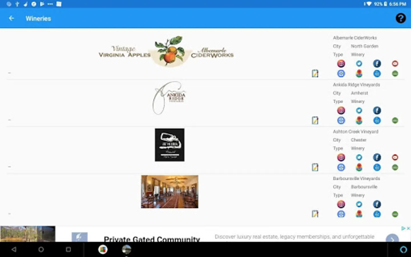 This app allows you to list the wineries, meaderies, cideries and distilleries by entering a partial name, selecting a county or selecting from the ten geographical regions in Virginia - Blue Ridge, Central, Chesapeake, Eastern, Hampton Roads, Heart of Appalachia, Northern, Shenandoah, Southern and Mountains. Using this app, you can plan your wine-centered vacation using the mileage from your current location or the mileage around a certain point in the app. After displaying the wineries/meaderies/distilleries/shops/restaurants, you are one tap away from their Facebook, Instagram, Twitter, Youtube, website, Yelp, TripAdvisor and Google Maps sites. The restaurants and shops listed will carry Virginia wines.