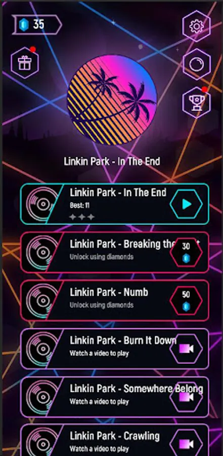 Choose your favorite song form our Linkin Park Tiles Hop: EDM Rush Ball list and only Touch, hold and drag on 2 sides to control the ball to jump over the tiles.