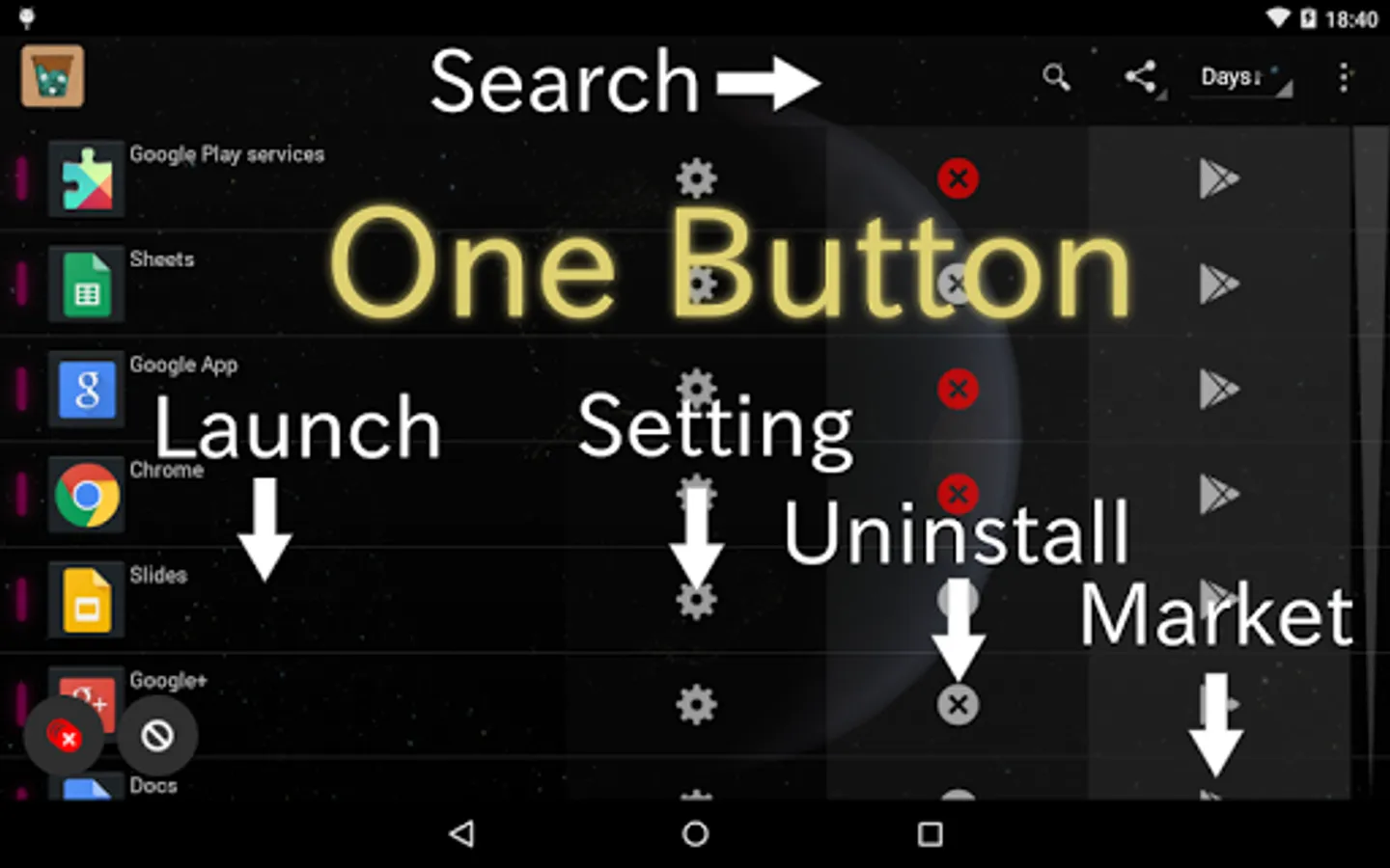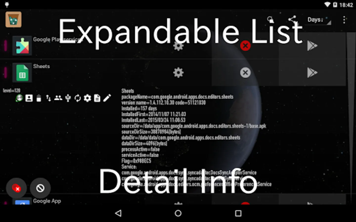 - Enable/Disable list buttons of App Launch, App Info, App Uninstall, Goto Goggle Play and Amazon App store.