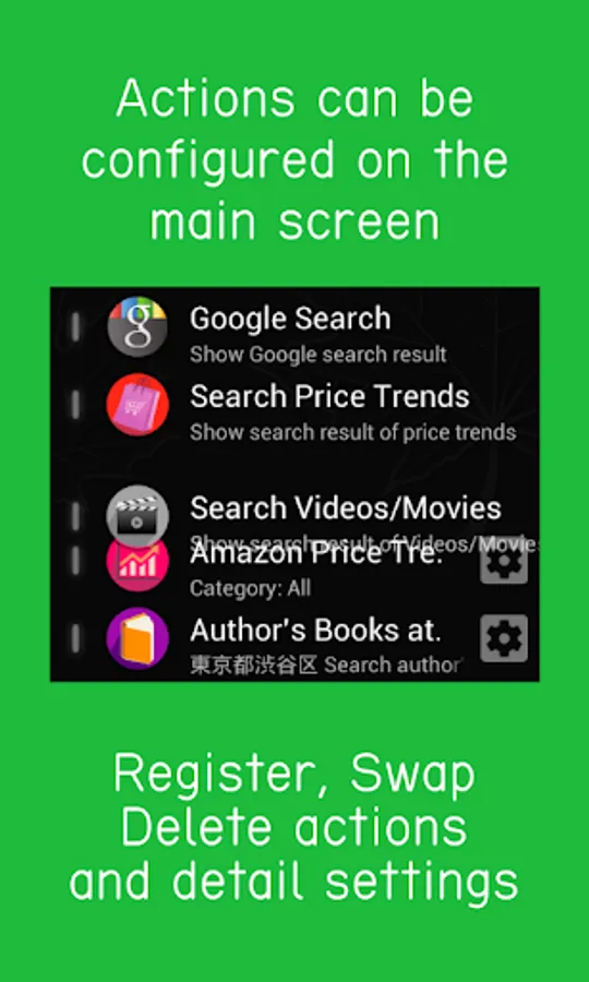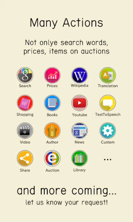 This app allows you to execute your regular operations for text quickly such as Web-search, price check, translation for words and/or sentence. Not just standard web search but also search items at eBay, Amazon and more.