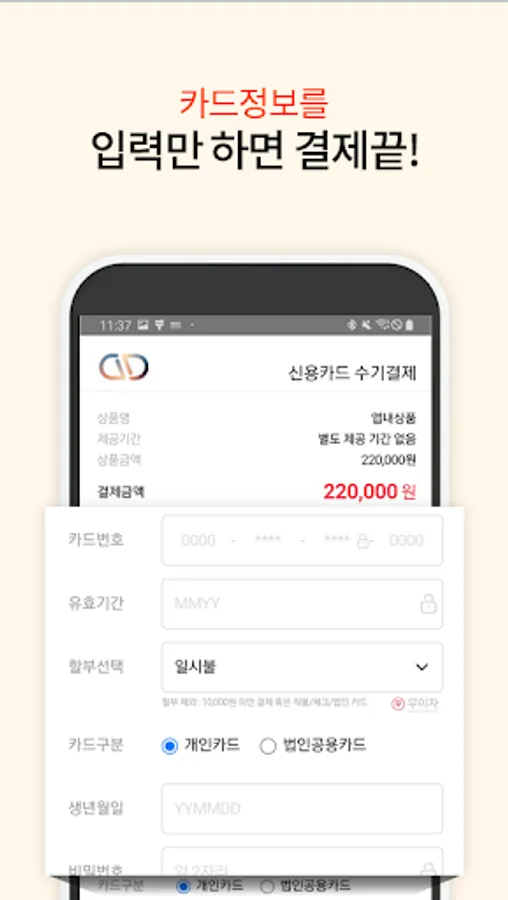 1. Manual payment: This is a service that allows you to easily pay by card with your card number/expiration date (customers can pay immediately without having to sign up for membership or install an app/certificate)