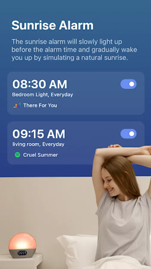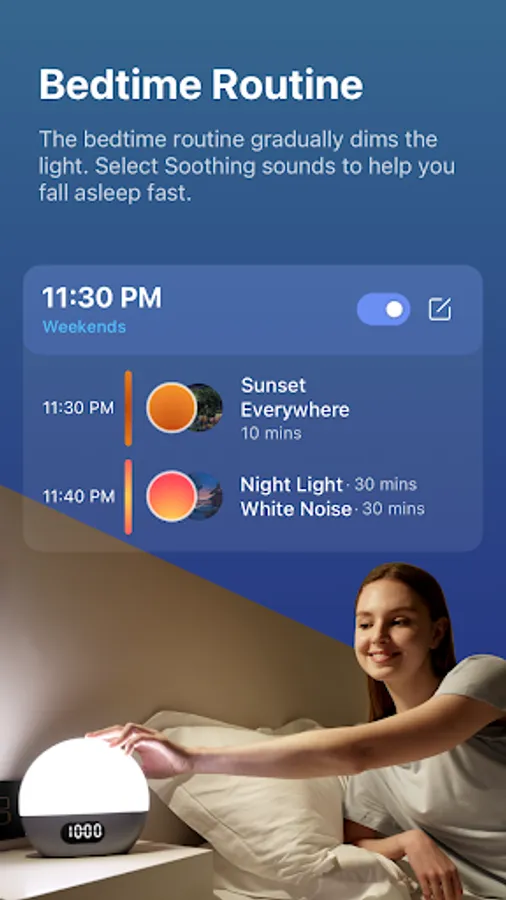 ● Pair your wake-up and sleep routines with your favorite songs, radio stations, or podcasts.
