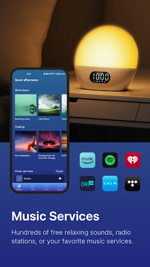 Calm your mind and experience a good night's sleep with a wide selection of soothing sounds and the relaxing simulation of a sunset.