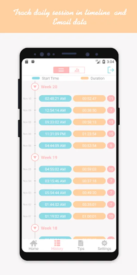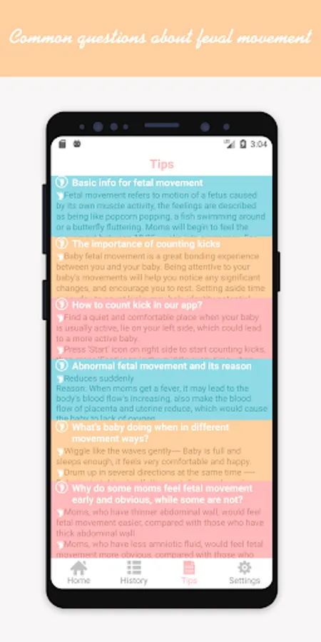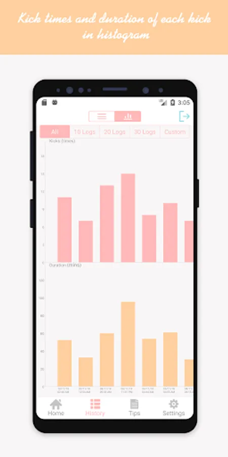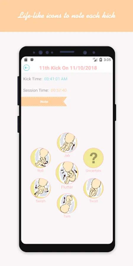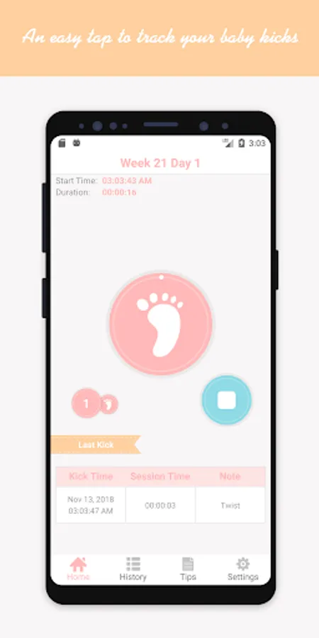 Tracking baby kicks is as easy as a tap if using this app, tap the button to record that fetal movement, it will keep baby kick’s time, duration with last kick, note: twist, turn and roll for example.
