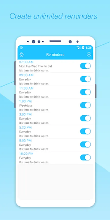 ⁃ Custom water drinking schedule. (Create unlimited reminders.)