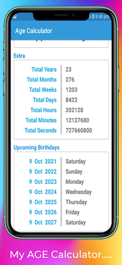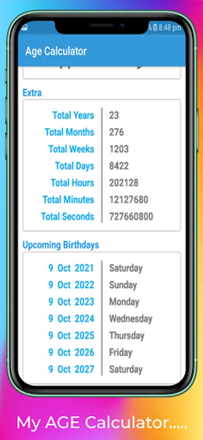 This application provides a straightforward and user-friendly interface. Simply choose your Date of Birth using the Age Calculator App and experience the wonders of this age calculator application. It will display your total age, upcoming birthdays, and more in the results.