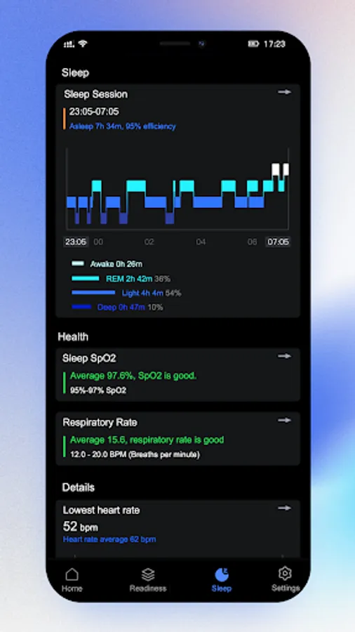 See your sleep stages — REM, deep, light — and discover your ideal bedtime.
