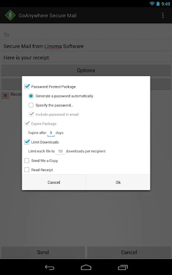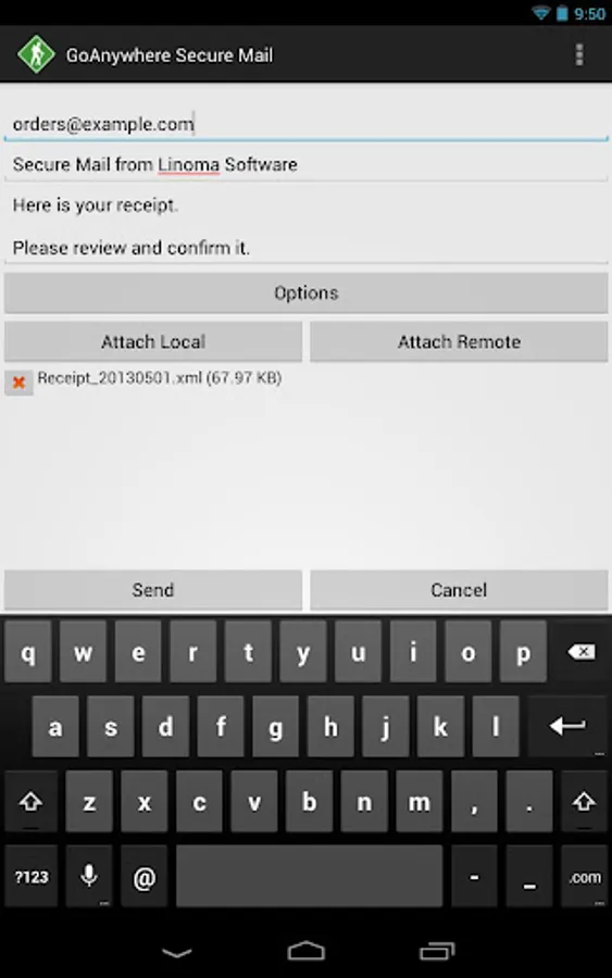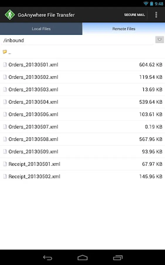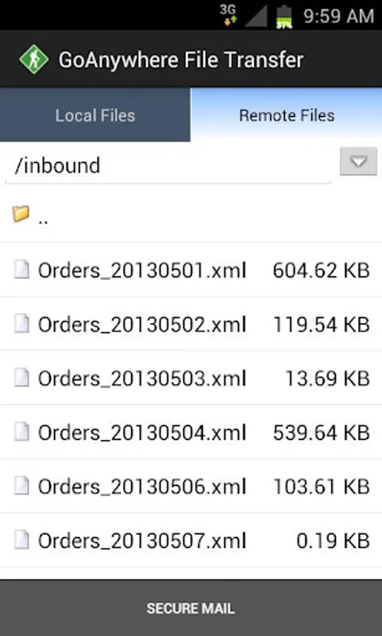 Quickly and securely transfer files securely between your Android device and your corporate servers using this free GoAnywhere File Transfer tool from HelpSystems. Send large or sensitive files securely to your customers and trading partners using GoAnywhere's Secure Mail feature included in the app. This tool requires that GoAnywhere Services is installed and licensed on your back office server.