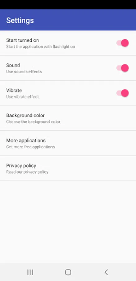 The configuration menu allows you to enable sound and vibration, to select background colors, and to allow you to turn on the device’s flashlight automatically when your app starts.