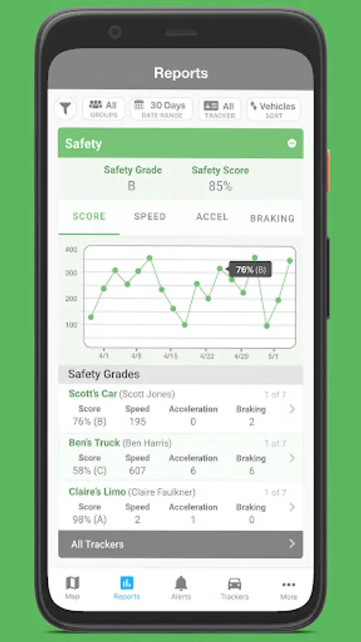 - View a breadcrumb location history for each vehicle. Clickable icons provide speed, direction, and stops information.