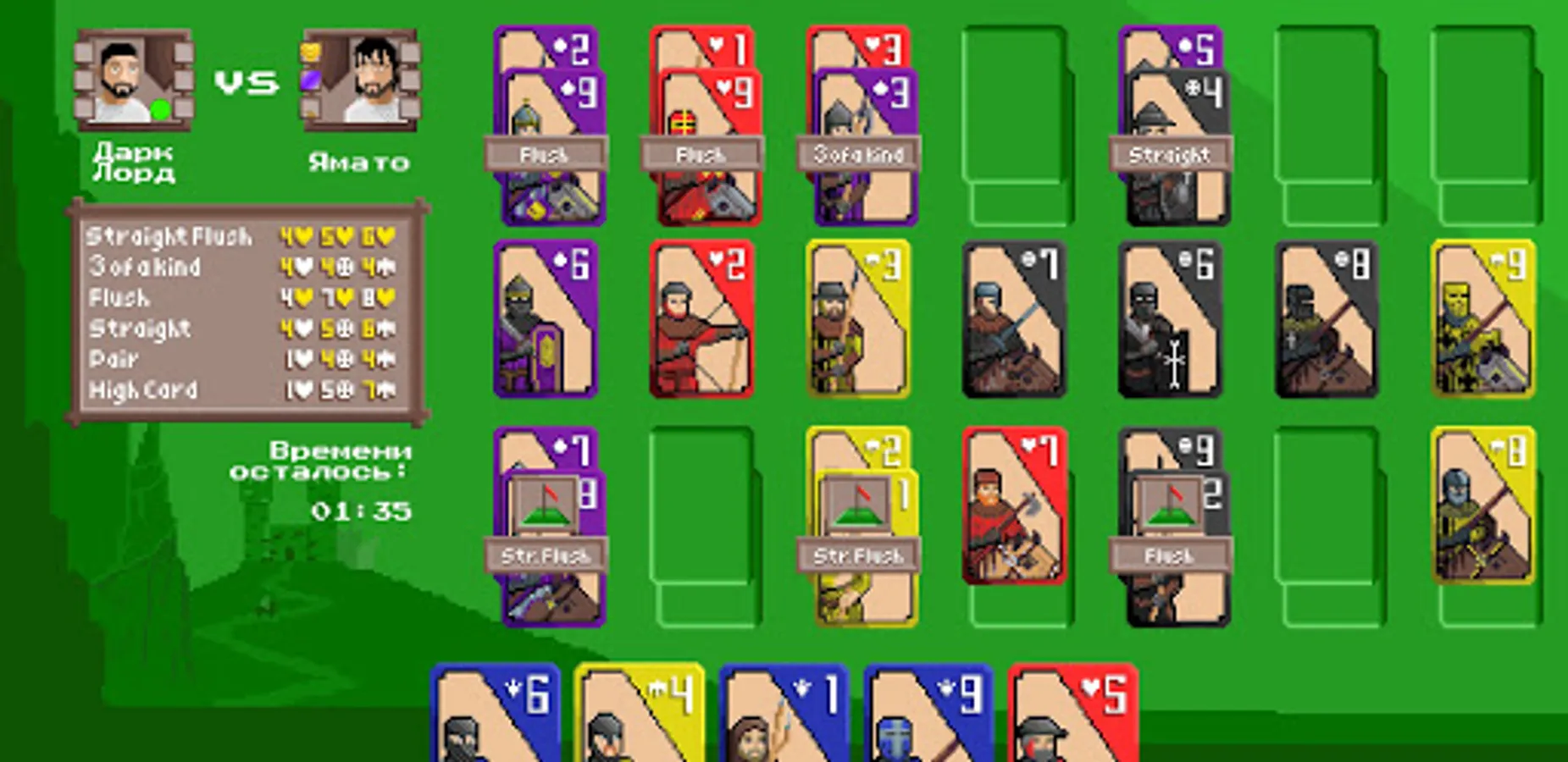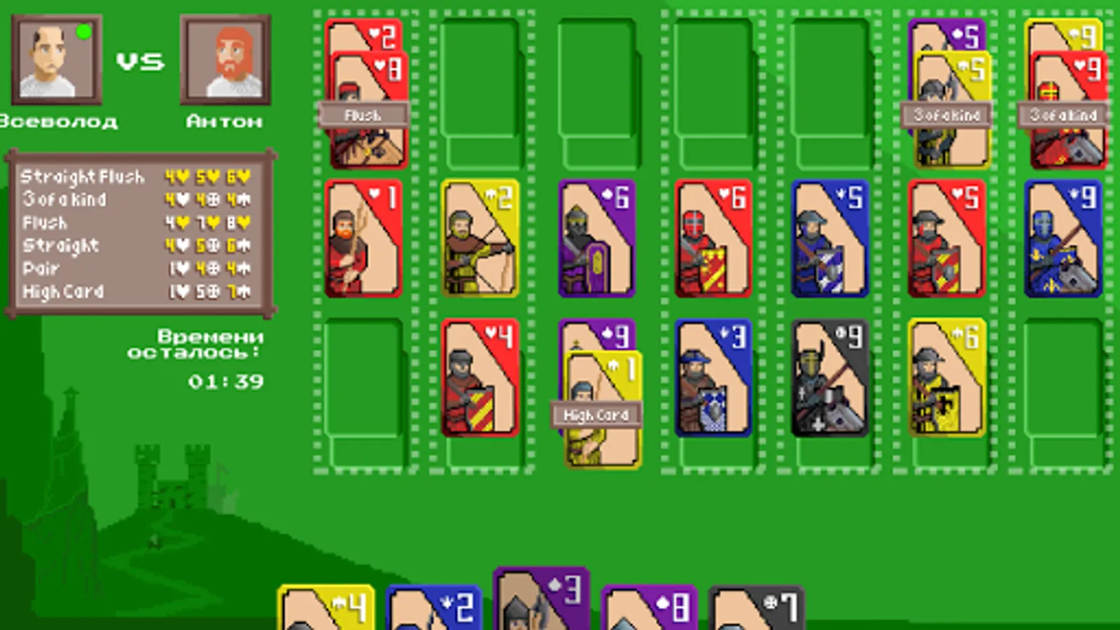 The balance had to be re-balanced at home. The suits became 5, otherwise it is more difficult to collect a tee than a straight flash. I drew soldiers and houses. Lyosha wrote the code.