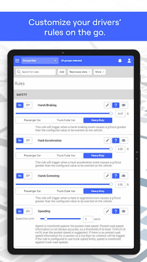 Tracking your vehicle not only reduces the risk, but also improve your capability to report on safety items such as risk and safety reports, driver behaviors, complete vehicle history log, audible warnings, instant accident notifications, alert button and training.