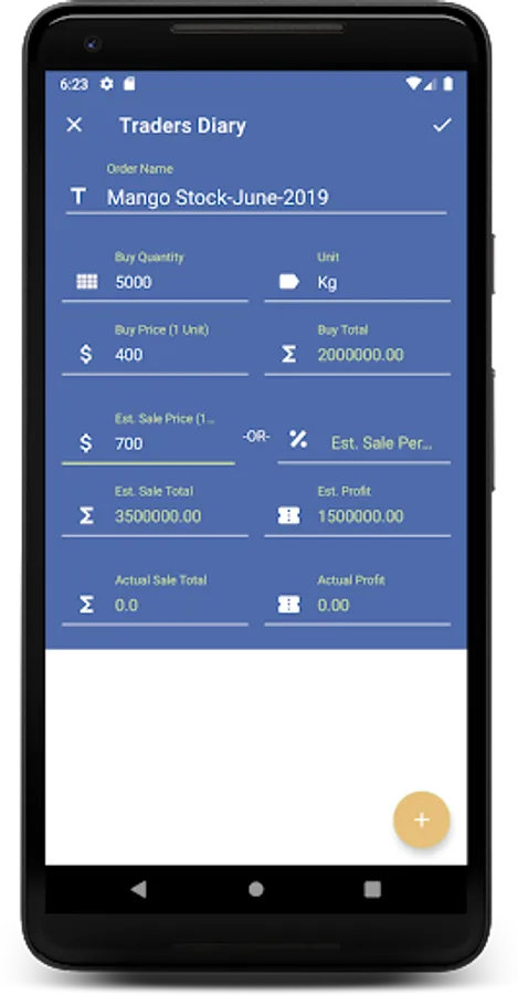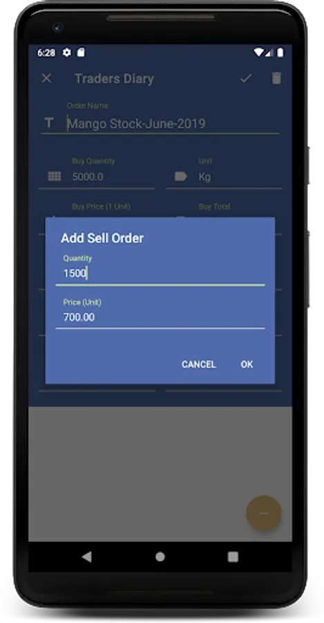 Now you want a sale that mangoes to shopper & wishes to add a record of it. Click on the mango order card. It will open the main details card. Now, the yellow circle button is clicked on the right side of the screen. It will open the dialogue in that dialogue; the remaining stock quantity of order & set sale price per unit will appear. You can change both values in case of bargaining with shoppers sale price will change so that you can adjust it manually, or otherwise, you can continue with it. And when you click ok, it will add a record of sale (1000 Kg at 750 Rs per Kg = 7,50,000 Rs) on that screen & the main screen will update with new remaining stock & total remaining price. You can add a sale order until the store gets zero.